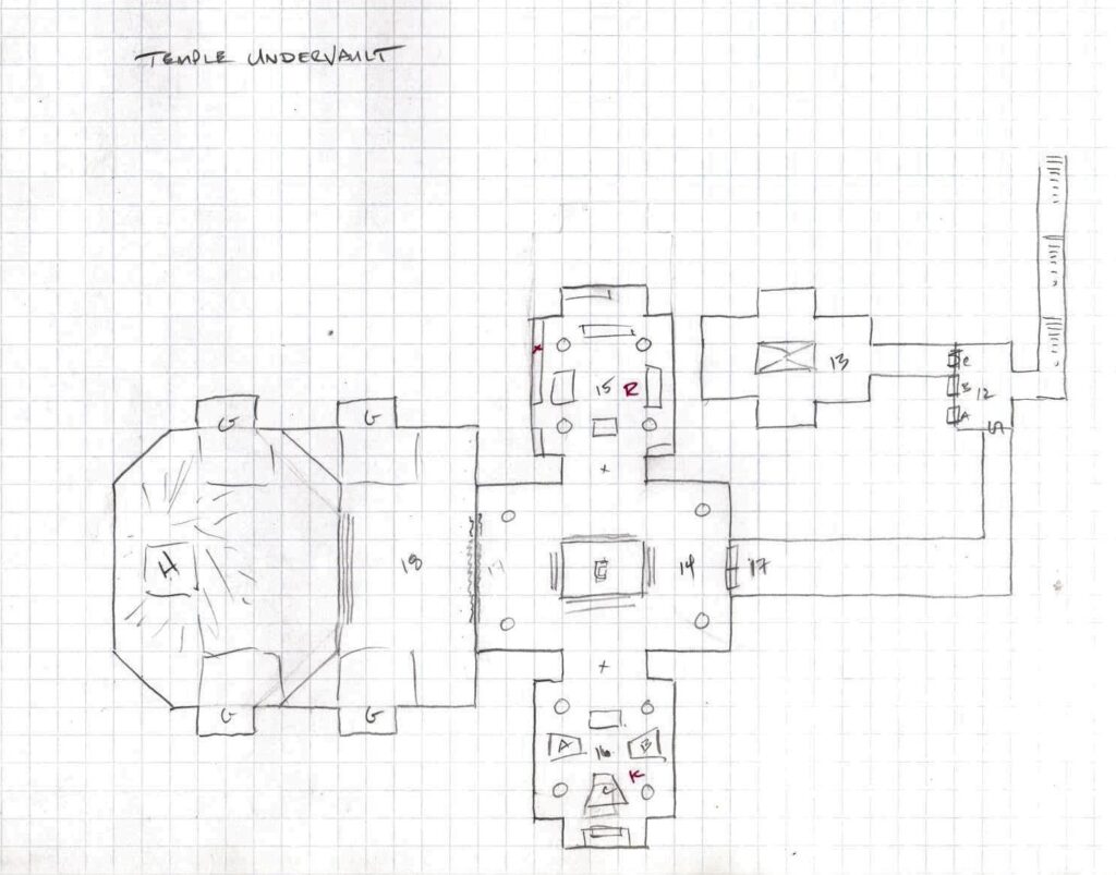 12. The entry room to the vault consists of a bare room with three identical metal doors. Each door has a different glyph on it written in Infernal, the image representing Order (A), Obedience (B) and Subterfuge (C). Anyone touching one of the doors not of Lawful or Evil alignment will set off a Greater Glyph of Warding (A – Chain Lightning, 15d6, DC21 save, B – Blast 10d8, DC21 Save, C – Baleful Polymorph, rat, DC20 save). Each door also has an ornate keyhole with a challenging lock (DC32) that if successfully opened, will allow the door to swing forward to reveal a blank wall. Behind door C is a secret door DC30 detect.
