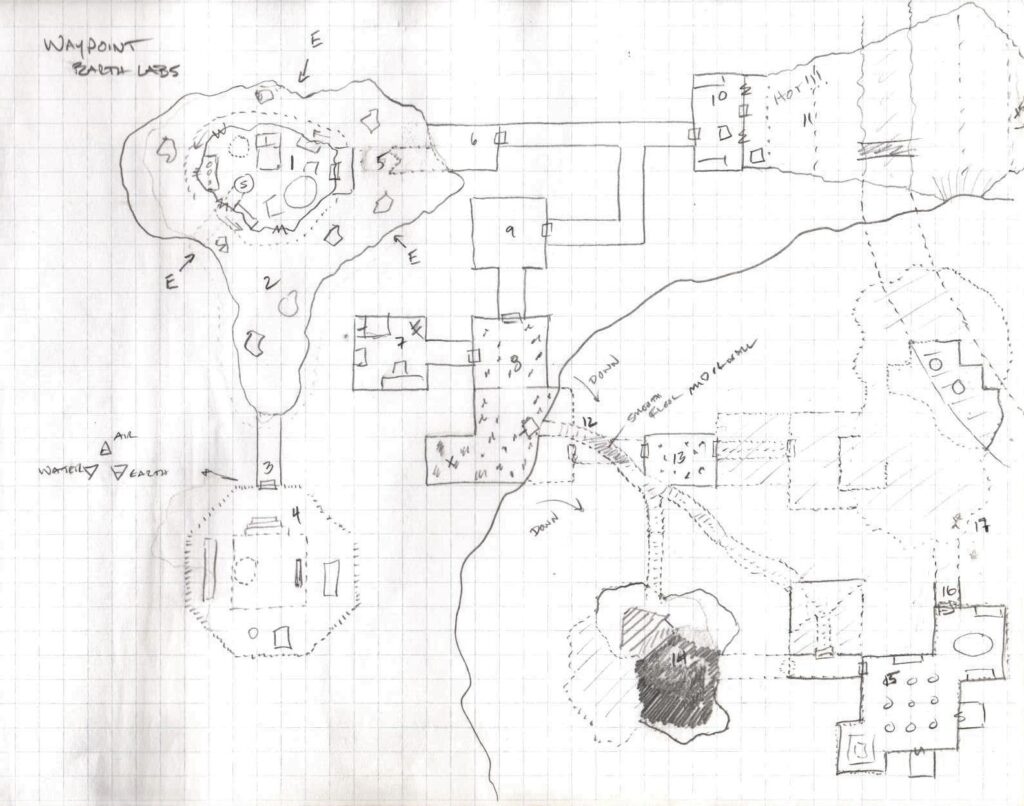 5) An invisible wall of force acts as a bridge over the chasm from Ciuq’s room to the complex beyond. However, after the disaster, a 7-8’ section of the Wall closest to the room has separated leaving a gap to the floor below. DC10 Acrobatics to cross with a jump. If missed, DC20 Ref to catch lip, a second DC20 ref to catch edge of the walkway below (2d6 dam), otherwise it is a 120’ drop (12d6)