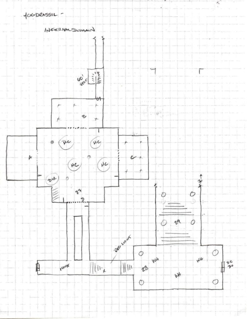 ​28.    First line of defense – this large room (20’ tall) is always guarded by loyal creatures from the kennels who are trained to attack anyone not escorted by a known master and make noise when they sense any unfamiliar scent. At the X in the corridor, the closest Warhound can roll a DC10 Per roll to smell the approaching party if they do not mask themselves somehow.