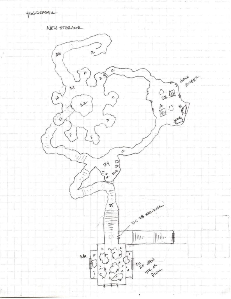 This extravagantly appointed bedroom is dominated by a huge 10’ x 10’ bed on the right wall. A sturdy desk and chairs occupy the near corners and on the far side of the room is a strange tree-trunk looking object that appears to be rising out of the floor to a height of about 7’ and 3’ in diameter. A 1’ wide hollow in the trunk reveals a shallow basin containing some sort of dark liquid.